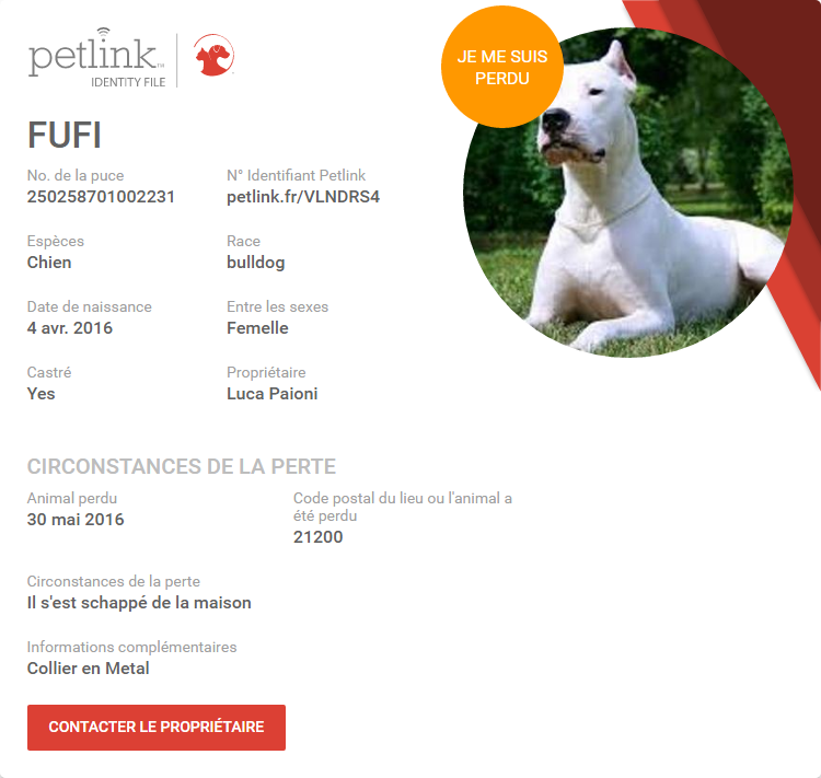 pour changer le statut de votre animal et le déclarer perdu : cliquez ici
