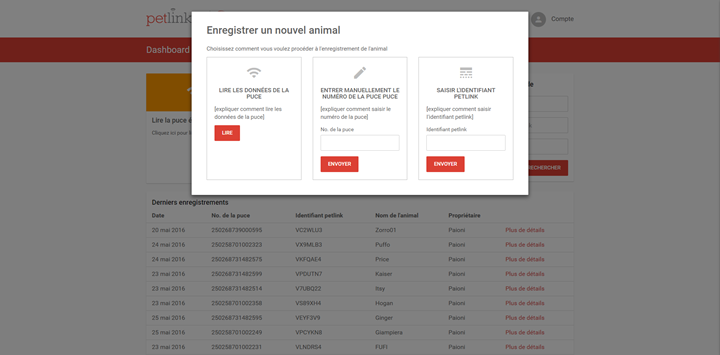 Alors que les vétérinaires accèdent aux fiches des animaux en important le n° de puce lu par leur lecteur, les particuliers accèdent à la fiche de leur animal par l’identifiant petlink de la médaille ou celui de la pet identy card.
